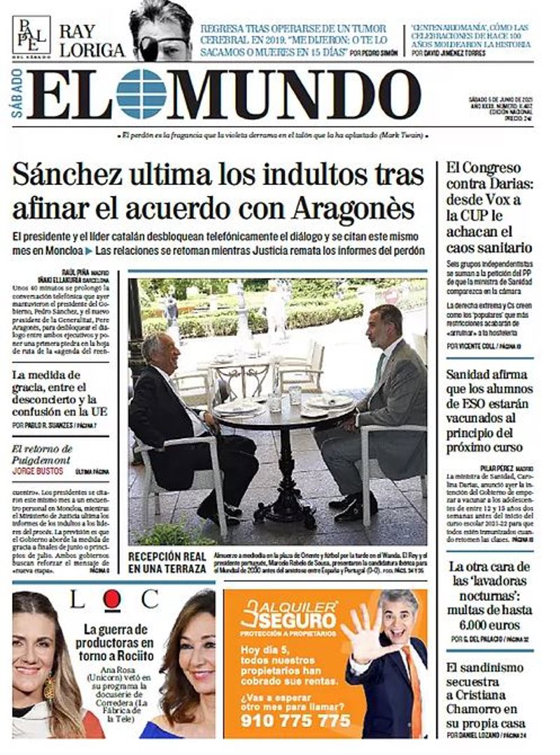 EL MUNDO: "Sánchez ultima los indultos tras afinar el acuerdo con Aragonès"; "La medida de gracia, entre el desconcierto y la confusión en la UE"; "El Congreso contra Darias: desde Vox a la CUP le achacan el caos sanitario"; "Sanidad afirma que los alumnos de ESO estarían vacunados al principio del próximo curso"; "La otra cara de las 'lavadoras nocturnas': multas de hasta 6.000 euros"; "El sandinismo secuestra a Cristina Chamorro en su propia casa".