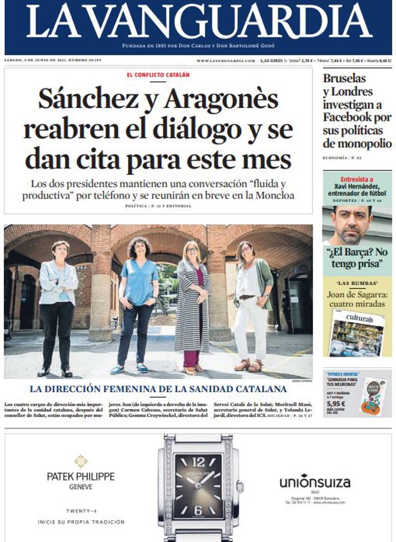 LA VANGUARDIA: "Sánchez y Aragonès reabren el diálogo y se dan cita para este mes"; "Bruselas y Londres investigan a Facebook por sus políticas de monopolio"; "La dirección femenina de la sanidad catalana".