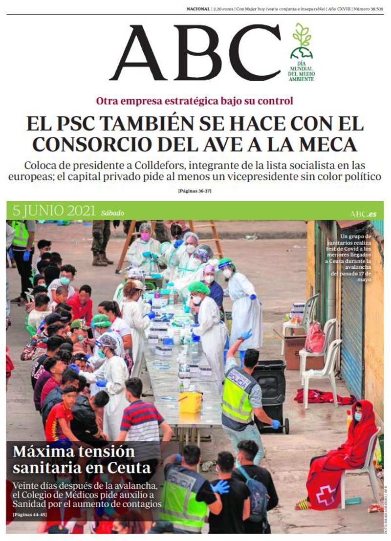 ABC: "El PSC también se hace con el consorcio del AVE a La Meca"; "Máxima tensión sanitaria en Ceuta. Veinte días después de la avalancha, el Colegio de Médicos pide auxilio a Sanidad por el aumento de contagios".