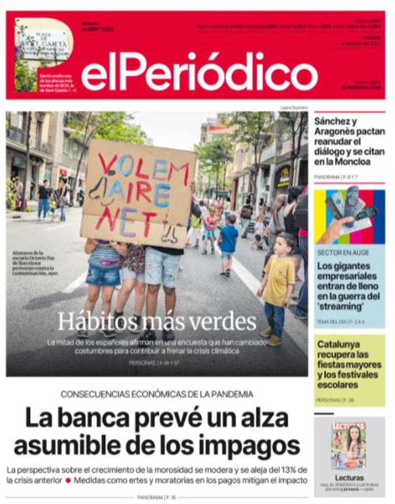EL PERIÓDICO: "Hábitos más verdes"; "La banca prevé un alza asumible de los impagos"; "Sánchez y Aragonès pactan reanudar el diálogo y se citan en la Moncloa"; "Los gigantes empresariales entran de lleno en la guerra del 'streaming'"; "Catalunya recupera las fiestas mayores y los festivales escolares".