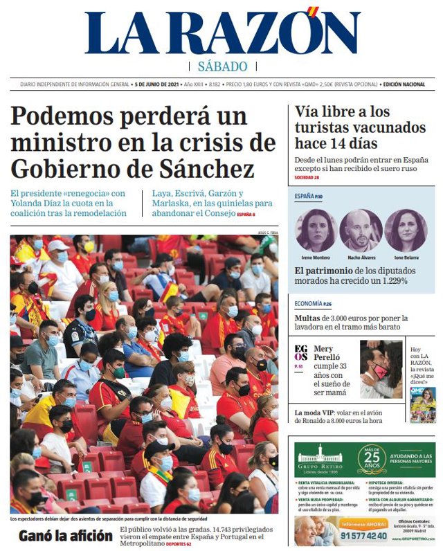 LA RAZÓN: "Podemos perderá un ministro en la crisis de Gobierno de Sánchez"; "Ganó la afición"; "Vía libre a los turistas vacunados hace 14 días"; "El patrimonio de los diputados morados ha crecido un 1.229%"; "Multas de 3.000 euros por poner la lavadora en el tramo más barato".