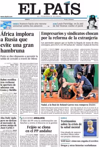 EL PAÍS: África implora a Rusia que evite una gran hambruna Putin se dice dispuesto a permitir la salida de cereales a través de Odesa"; "Empresarios y sindicatos chocan por la reforma de la extranjería. Las patronales apoyan que se facilite la llegada de mano de obra extranjera, pero UGT y CC OO tachan de "clasista" el plan de Escrivá"; "Rabat rectifica tras rechazar la apertura de aduanas con Ceuta y Melilla"; "Abu Dabi vigila pero no detiene al mercader de armas amigo de Juan Carlos I"; "Feijóo se clona en el PP andaluz".