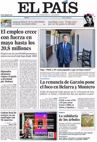 EL PAÍS: "El empleo crece con fuerza en mayo hasta los 20,8 millones"; "Page: "PSOE y PP están jugando a que no haya centro""; "Diputados alemanes viajan a España a presionar por Doñana"; "La renuncia de Garzón pone el foco en Belarra y Montero"; "Cadena letal de errores en un naufragio con 94 muertos"; "El PSE se une a PNV y PP para cortar el paso a Bildu en Vitoria y Gipuzkoa".