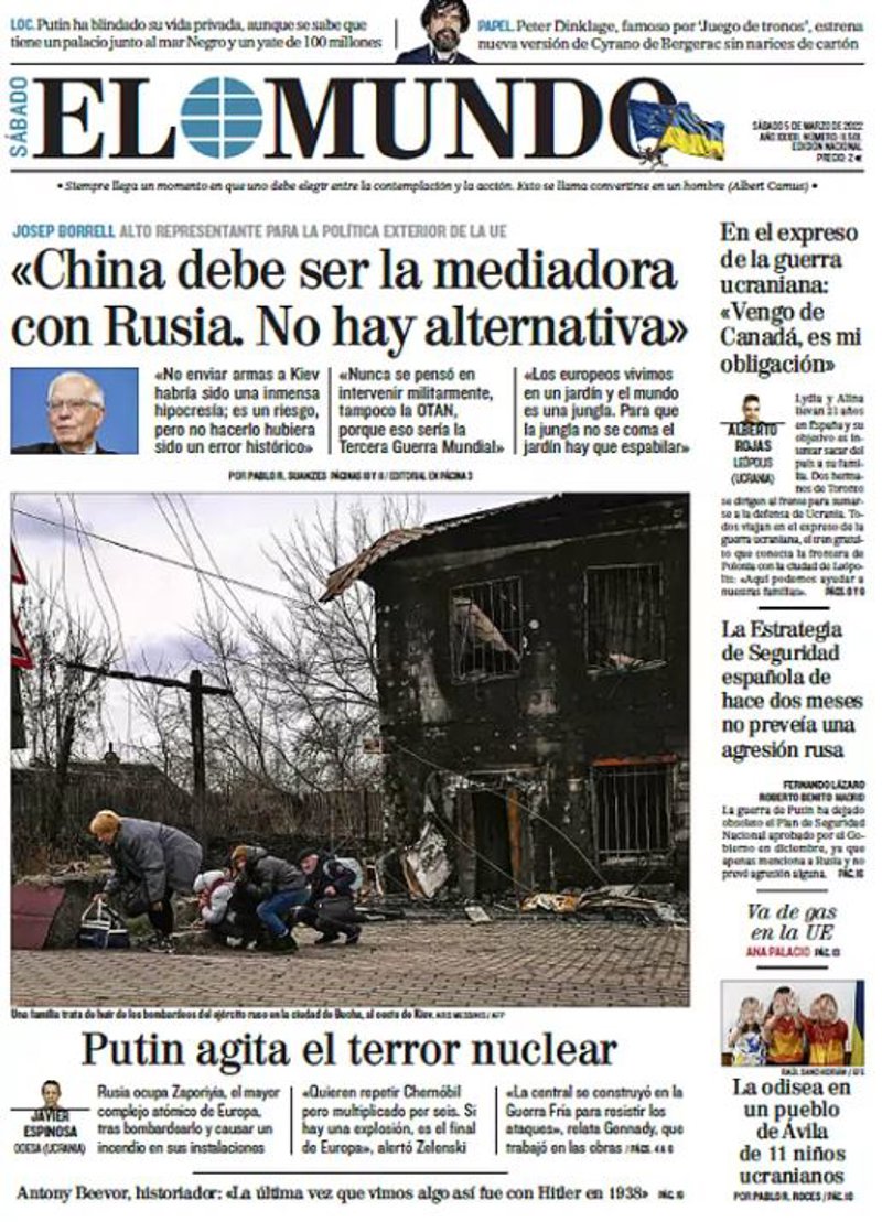 EL MUNDO: "Josep Borrell: "China debe ser la medioadora con Rusia. No hay alternativa"; "Putin agita el terror nuclear"; "En el expreso de la guerra ucraniana: "Vengo de Canadá, es de mi obligación"; "La Estrategia de Seguridad española de hace dos meses no preveía una agresión rusa".