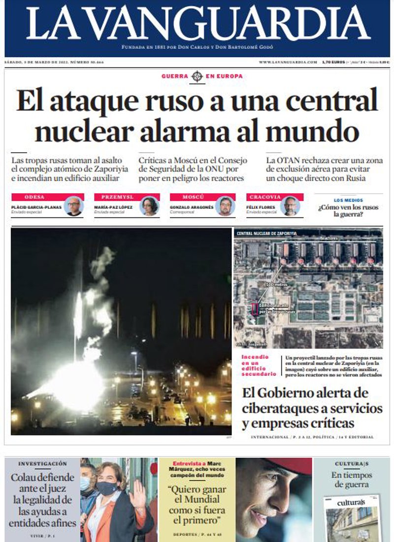 LA VANGUARDIA: "El ataque ruso a una central nuclear alarma al mundo"; "El Gobierno alerta de ciberataques a servicios y empresas críticas"; "Colau defiende ante el juez la legalidad de las ayudas a entidades afines".