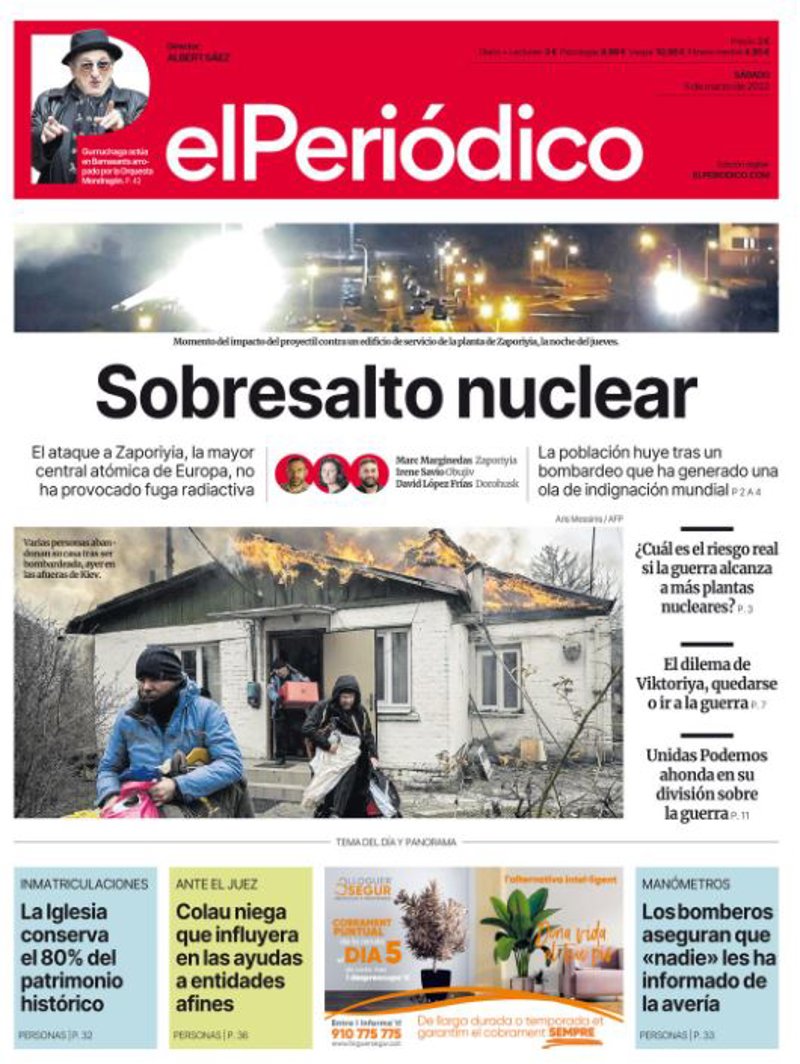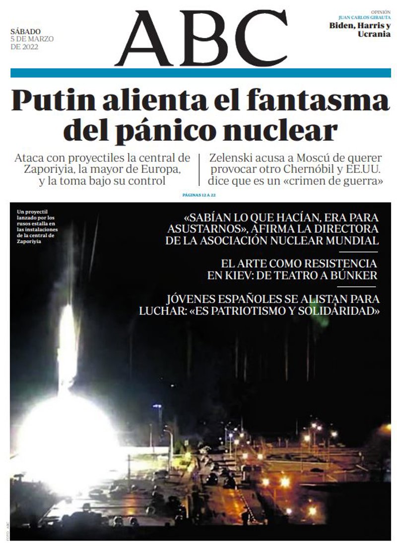 ABC: "Putin alienta el fantasma del pánico nuclear. Ataca con proyectiles la central de Zaporiyia, la mayor de Europa, y la toma bajo su control. Zelenski acusa a Moscú de querer provocar otro Chernóbil y EE.UU. dice que es un "crimen de guerra"".