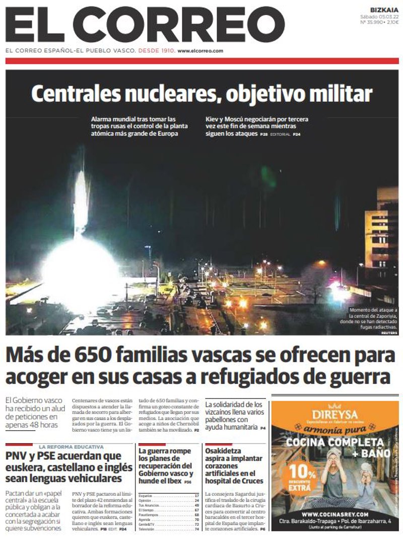 EL CORREO: "Centrales nucleares, objetivo militar"; "Más de 650 familias vascas se ofrecen para acoger en sus casas a refugiados de guerra"; "PNV y PSE acuerdan que euskera, castellano e inglés sean lenguas vehiculares"; "La guerra rompe los planes de recuperación del Gobierno vasco y hunde el Ibex"; "Osakidetza aspira a implantar corazones artificiales en el hospital de Cruces".
