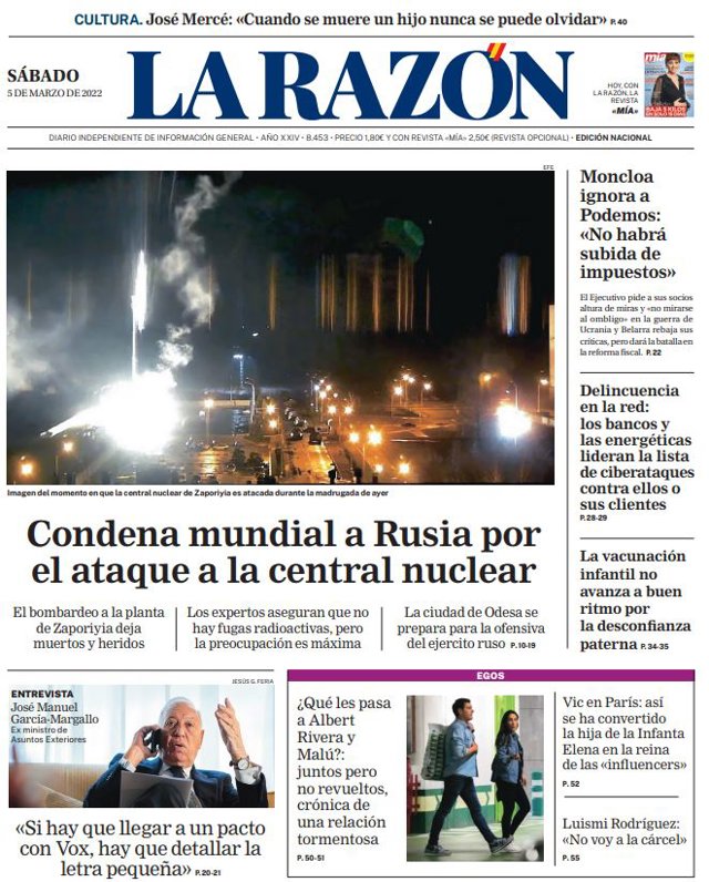 LA RAZÓN: "Condena mundial a Rusia por el ataque a la central nuclear"; "Entrevista José Manuel García-Margallo: "Si hay que llegar a un pacto con Vox, hay que detallar la letra pequeña"; "Moncloa ignora a Podemos: "No habrá subida de impuestos""; "Delincuencia en la red: los bancos y las energéticas lideran la lista de ciberataques