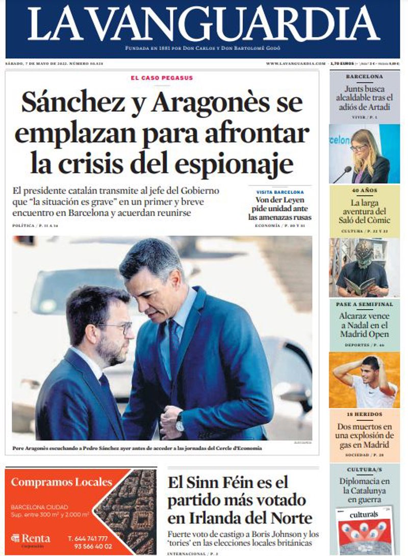 LA VANGUARDIA: "Sánchez y Aragonès se emplazan para afrontar la crisis del espionaje"; "El Sinn Féin es el partido más votado en Irlanda del Norte".