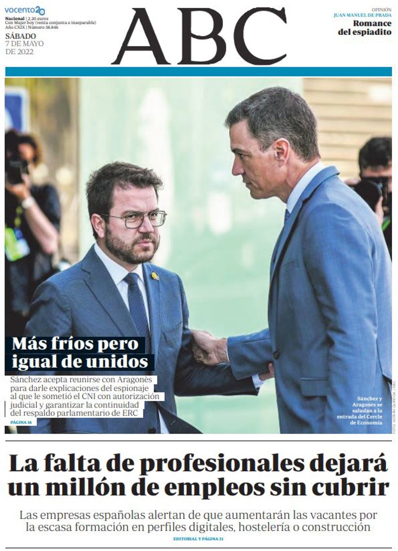 ABC: "Más fríos pero igual de unidos. Sánchez acepta reunirse con Aragonès para darle explicaciones del espionaje al que le sometió el CNI con autorización judicial y garantizar la continuidad del respaldo parlamentario de ERC"; "La falta de profesionales dejará un millón de empleos sin cubrir. Las empresas españolas alertan de que aumentarán las vacantes por la escasa formación en perfiles digitales, hostelería o construcción".