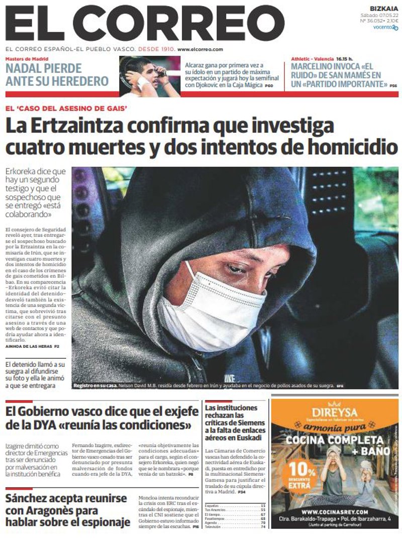EL CORREO: "La Ertzaintza confirma que investiga cuatro muertes y dos intentos de homicidio"; "El Gobierno vasco dice que el exjefe de la DYA "reunía las condiciones""; "Sánchez acepta reunirse con Aragonès para hablar sobre el espionaje"; "Las instituciones rechazan las críticas de Siemens a la falta de enlaces aéreos en Euskadi".