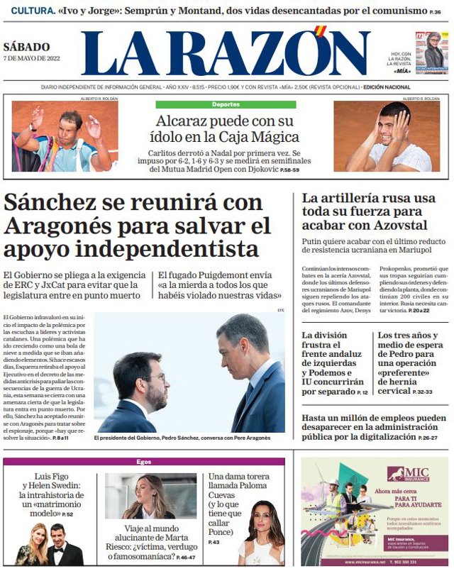 LA RAZÓN: "Sánchez se reunirá con Aragonés para salvar el apoyo independentista"; "La artillería rusa usa toda su fuerza para acabar con Azovstal"; "La división frustra el frente andaluz de izquierdas y Podemos e IU concurrirán por separado"; "Los tres años y medio de espera de Pedro para una operación "preferente" de hernia cervical"; "Hasta un millón de empleos pueden desaparecer en la administración pública por la digitalización".