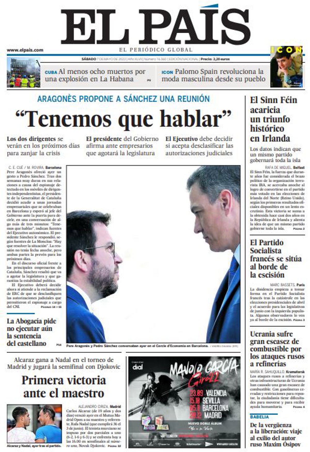 EL PAÍS: ""Tenemos que hablar""; "La Abogacía pide no ejecutar aún la sentencia del castellano"; "Primera victoria ante el maestro"; "El Sinn Féin acaricia un triunfo histórico en Irlanda"; "El Partido Socialista francés se sitúa al borde de la escisión"; "Ucrania sufre gran escasez de combustible por los ataques rusos a refinerías".