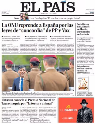 EL PAÍS: "La ONU reprende a España por las leyes de "concordia" de PP y Vox"; "Urtasun cancela el Premio Nacional de Tauromaquia por "la tortura animal""; "Socialistas y ERC, aliados en Madrid, duros rivales en Cataluña"; "Puig debuta en Bolsa sin cambios, valorada en 14.000 millones".