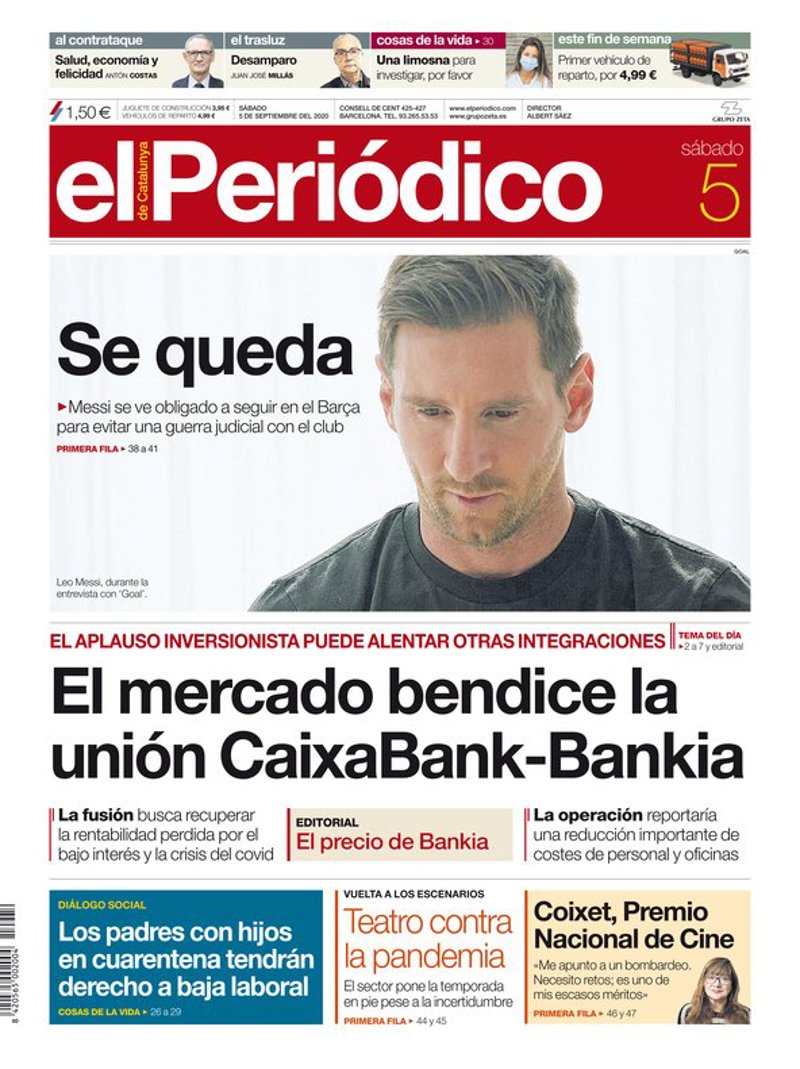 EL PERIÓDICO: "Se queda. Messi se ve obligado a seguir en el Barça para evitar una guerra judicial con el club"; "El mercado bendice la unión CaixaBank-Bankia"; "Los padres con hijos en cuarentena tendrán derecho a baja laboral"; "Coixet, Premio Nacional de Cine"; "Teatro contra la pandemia".