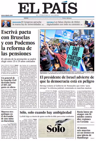 las pensiones"; "El presidente de Israel advierte de que la democracia está en peligro"; "Un general de la Guardia Civil desviaba hasta el 80% del gasto en obras"; "Mueren tres geólogos en el derrumbe de una mina en Barcelona"; "Sólo, solo cuando hay ambigüedad"; "Rusia lanza un ataque con 81 misiles contra diez regiones en Ucrania"; "Al menos seis muertos en un tiroteo en una iglesia de Hamburgo".