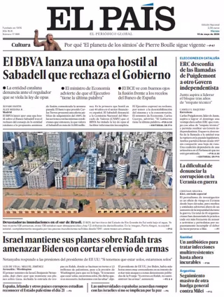 EL PAÍS: "El BBVA lanza una opa hostil al Sabadell que rechaza el Gobierno"; "Israel mantiene sus planes sobre Rafah tras amenazar Biden con cortar el envío de armas"; "ERC desconfía de las llamadas de Puigdemont a otro Govern independentista"; "La dificultad de denunciar la corrupción en la Ucrania en guerra"; "Un antibiótico para tratar infecciones multirresistentes hasta ahora incurables"; "Seguimiento masivo de otra huelga general contra Milei".