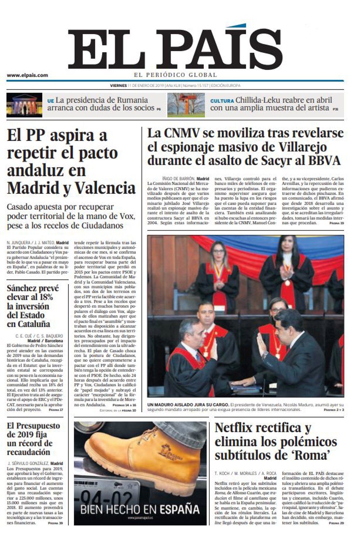 EL PAÍS: "El PP aspira a repetir el pacto andaluz en Madrid y Valencia"; "La CNMV se moviliza tras revelarse el espionaje masivo de Villarejo durante el asalto de Sacyr al BBVA"; "Sánchez prevé elevar al 18% la inversión del Estado en Cataluña"; "El Presupuesto de 2019 fija un récord de recaudación".