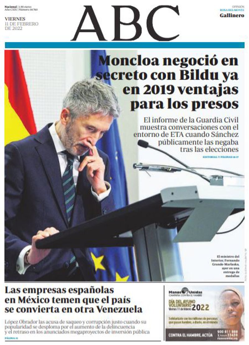 ABC: "Moncloa negoció en secreto con Bildu ya en 2019 ventajas para los presos. El informe de la Guardia Civil muestra conversaciones con el entorno de ETA cuando Sánchez públicamente las negaba tras las elecciones"; "Las empresas españolas en México temen que el país se convierta en otra Venezuela. López Obrador las acusa de saqueo y corrupción justo cuando su popularidad se desploma por el aumento de la delincuencia y el retraso en los anunciados megaproyectos de inversión pública".