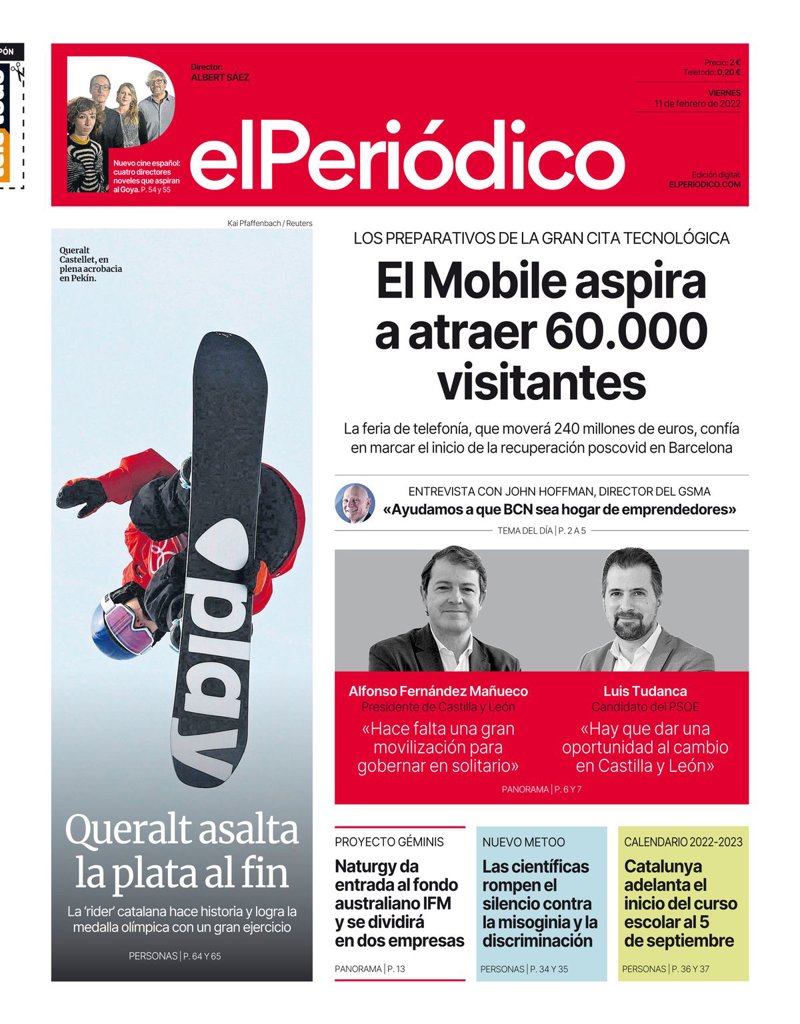 EL PERIÓDICO: "El Mobile aspira a atraer 60.000 visitantes"; "Queralt asalta la plata al fin"; "Alfonso Fernández Mañueco, presidente de Castilla y León: "Hace falta una gran movilización para gobernar en solitario""; "Luis Tudanca, candidato del PSOE: "Hay que dar una oportunidad al cambio en Castilla y León"; "Naturgy da entrada al fondo australiano IFM y se dividirá en dos empresas; "Las científicas rompen el silencio contra la misoginia y la discriminación"; "Catalunya adelanta el inicio del curso escolar al 5 de septiembre".