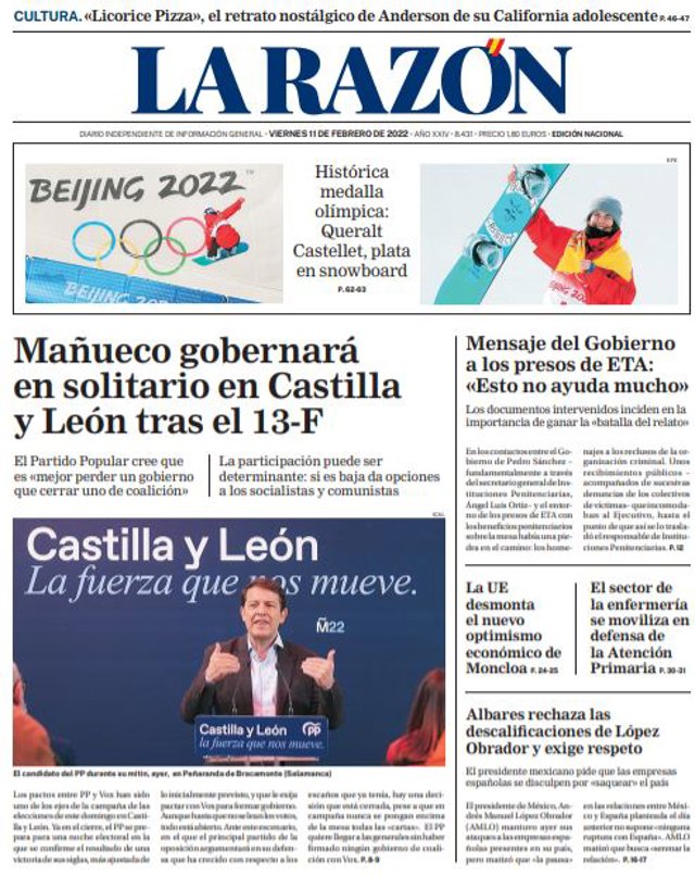 LA RAZÓN: "Mañueco gobernará en solitario en Castilla y León tras el 13-F"; "Mensaje del Gobierno a los presos de ETA: "Esto no ayuda mucho""; "La UE desmonta el nuevo optimismo económico de Moncloa"; "El sector de la enfermería se moviliza en defensa de la Atención Primaria"; "Albares rechaza las descalificaciones de López Obrador y exige respeto".