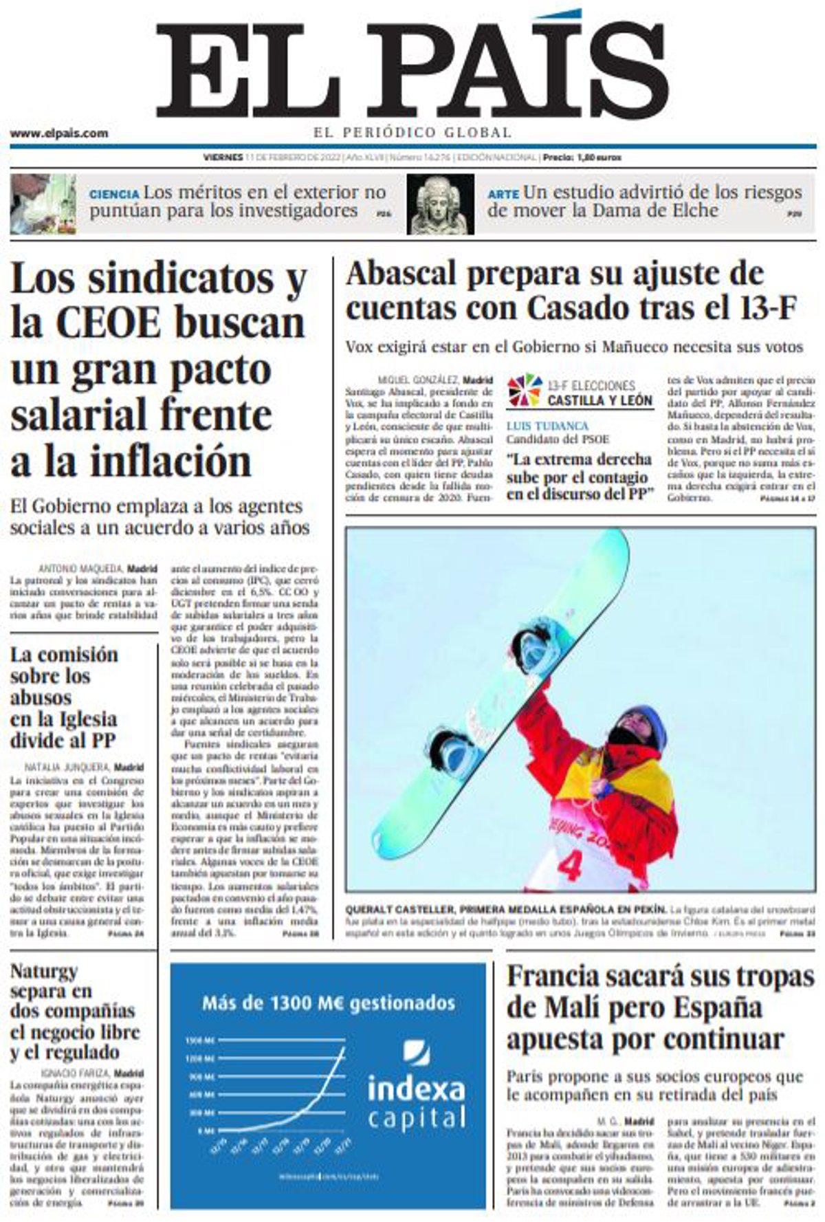 EL PAÍS: "Los sindicatos y la CEOE buscan un gran pacto salarial frente a la inflación"; "La comisión sobre los abusos en la Iglesia divide al PP"; "Naturgy separa en dos compañías el negocio libre y el regulado"; "Abascal prepara su ajuste de cuentas con Casado tras el 13-F"; "Francia sacará sus tropas de Malí pero España apuesta por continuar".