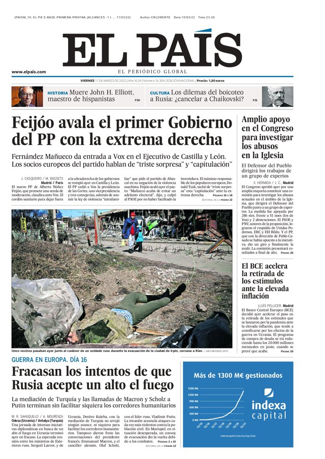 EL PAÍS: "Feijóo avala el primer Gobierno del PP con la extrema derecha"; "Amplio apoyo en el Congreso para investigar los abusos en la Iglesia"; "El BCE acelera la retirada de los estímulos ante la elevada inflación"; "Fracasan los intentos de que Rusia acepte un alto el fuego".