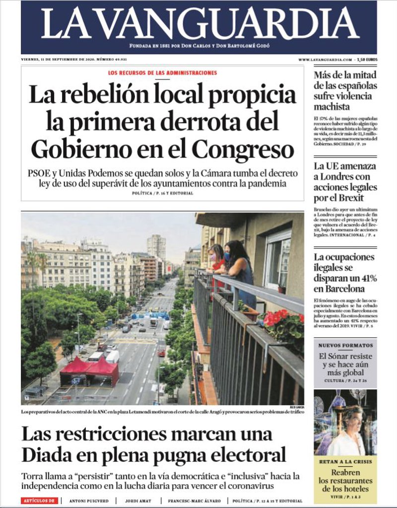LA VANGUARDIA: "La rebelión local propicia la primera derrota del Gobierno en el Congreso"; "Las restricciones marcan una Diada en plena pugna electoral"; "Más de la mitad de las españolas sufre violencia machista"; "La UE amenaza a Londres con acciones legales por el Brexit"; "Las ocupaciones ilegales se disparan un 41% en Barcelona".