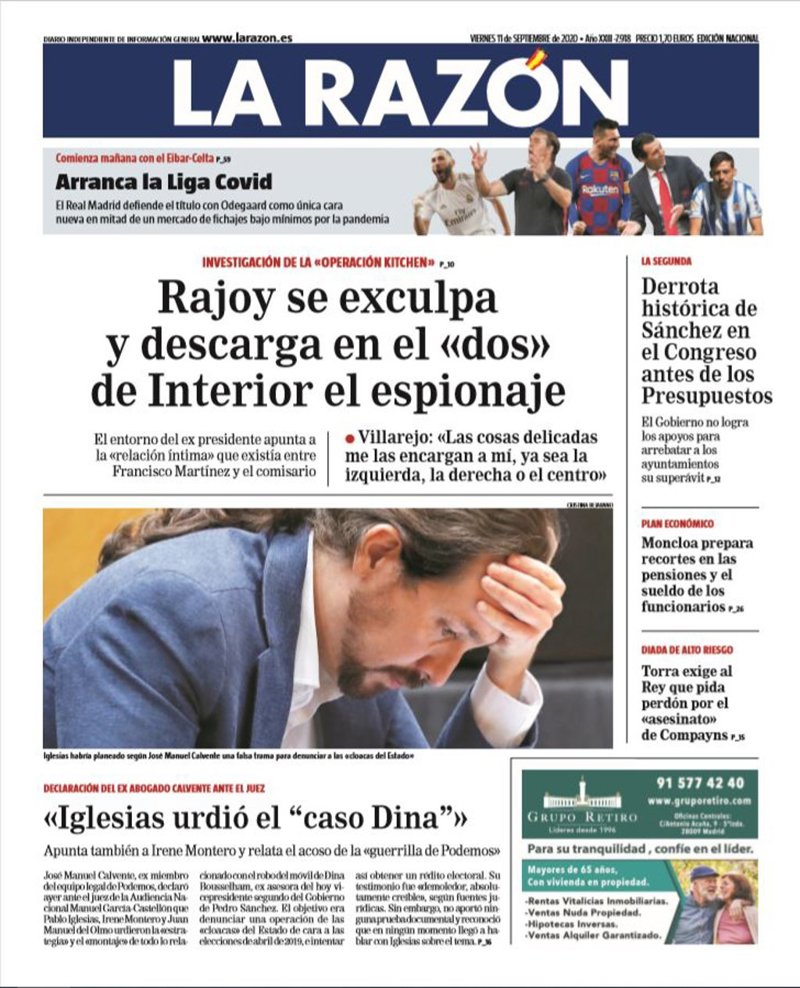 LA RAZÓN: "Rajoy se exculpa y descarga en el "dos" de Interior el espionaje. Villarejo: "Las cosas delicadas me las encargan a mí, ya sea la izquierda, la derecha o el centro""; ""Iglesias urdió el "caso Dina"". Declaración del ex abogado Calvente ante el juez"; "Derrota histórica de Sánchez en el Congreso antes de los Presupuestos"; "Moncloa prepara recortes en las pensiones y el sueldo de los funcionarios"; "Torra exige al Rey que pida perdón por el "asesinato" de Compayns".