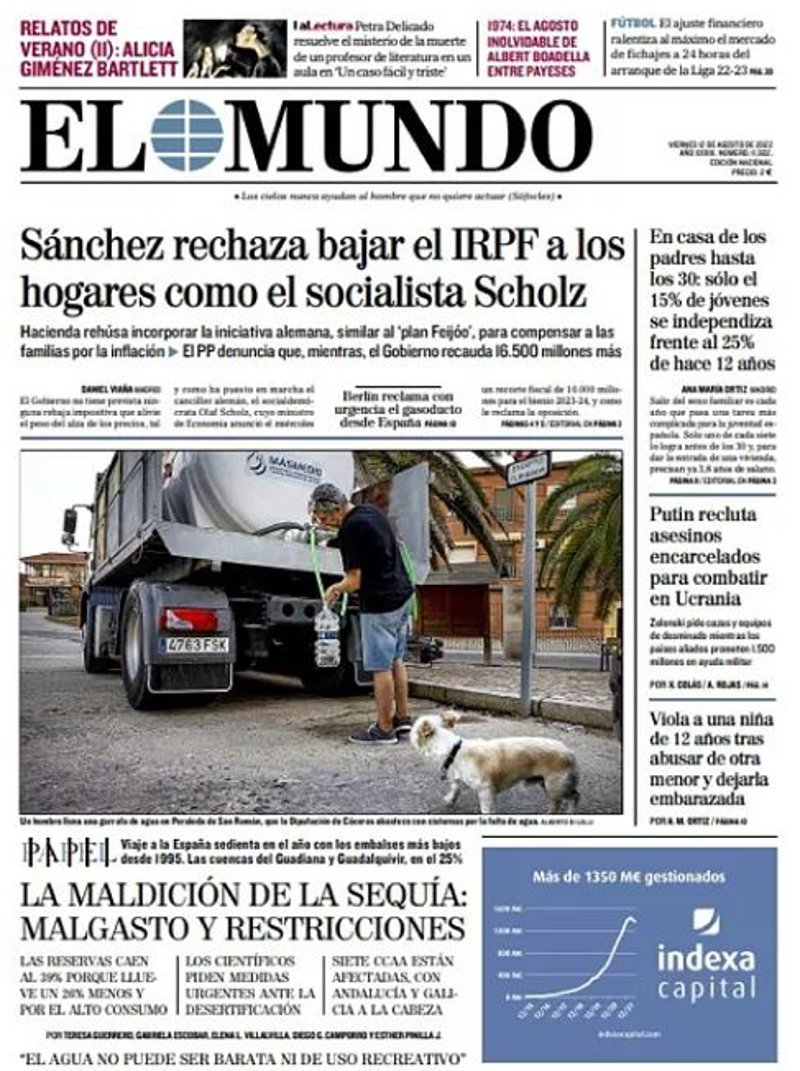 EL MUNDO: "Sánchez rechaza bajar el IRPF a los hogares como el socialista Scholz"; "En casa de los padres hasta los 30: sólo el 15% de jóvenes se independiza frente al 25% de hace 12 años"; "Putin recluta asesinos encarcelados para combatir en Ucrania"; "Viola a una niña de 12 años tras abusar de otra menor y dejarla embarazada".