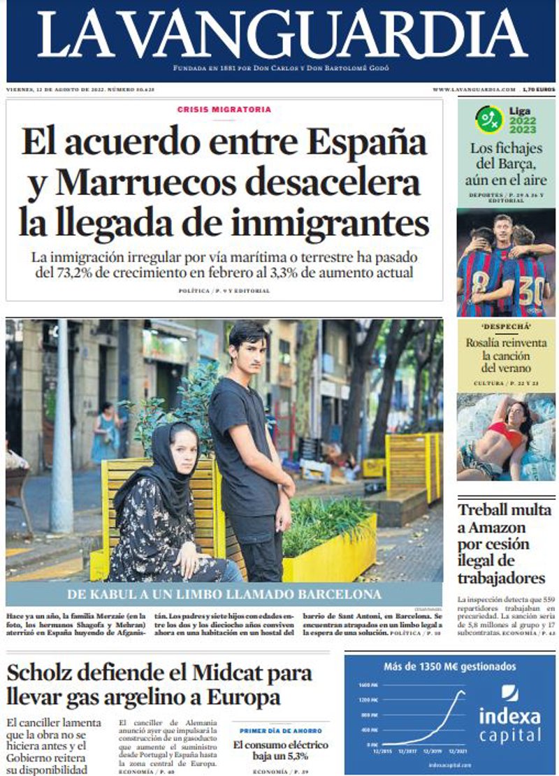 LA VANGUARDIA: "El acuerdo entre España y Marruecos desacelera la llegada de inmigrantes"; "Scholz defiende el Midcat para llevar gas argelino a Europa"; "Treball multa a Amazon por cesión ilegal de trabajadores".