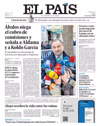 EL PAÍS: "Ábalos niega el cobro de comisiones y señala a Aldama y a Koldo García"; "El BCE rebaja los tipos hasta el 3% y empeora la previsión de crecimiento"; "Alepo recobra la vida entre las ruinas"; "El mayor centro de investigación del cáncer de España está en situación crítica"; "Las grandes tecnológicas pagarán una tasa para financiar el periodismo"; "Biden bate el récord de indultos en un día al conmutar 1.500 penas".