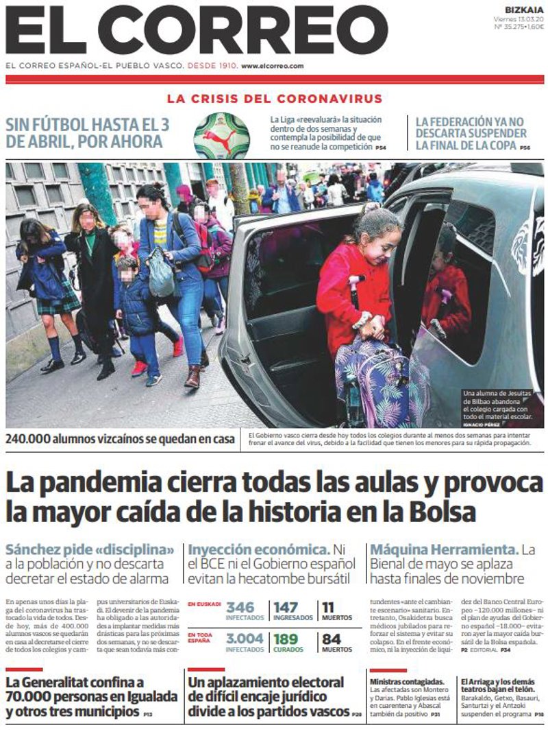 EL CORREO: "La pandemia cierra todas las aulas y provoca la mayor caída de la historia en la Bolsa"; "La Generalitat confina a 70.000 personas en Igualada y otros tres municipios"; "Un aplazamiento electoral de difícil encaje jurídico divide a los partidos vascos".