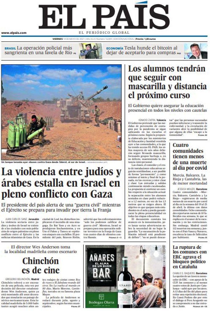 pleno conflicto con Gaza"; "Chichón es de cine. El director Wes Anderson toma la localidad madrileña como escenario"; "Los alumnos tendrán que seguir con mascarilla y distancia el próximo curso"; "Cuatro comunidades tienen menos de una muerte al día por covid"; "La ruptura de los comunes con ERC agrava el bloqueo político en Cataluña".
