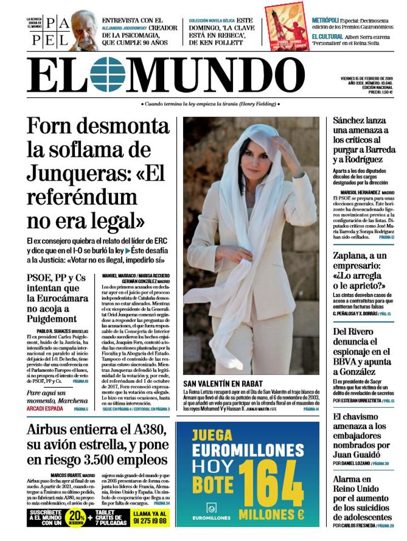 EL MUNDO: "Forn desmonta la soflama de Junqueras: 'El referéndum no era legal'"; "Sánchez lanza una amenaza a los críticos al purgar a Barreda y a Rodríguez"; "PSOE, PP y Cs intentan que la Eurocámara no acoja a Puigdemont"; "Airbus entierra el A380, su avión estrella, y pone en riesgo 3.500 empleos".
