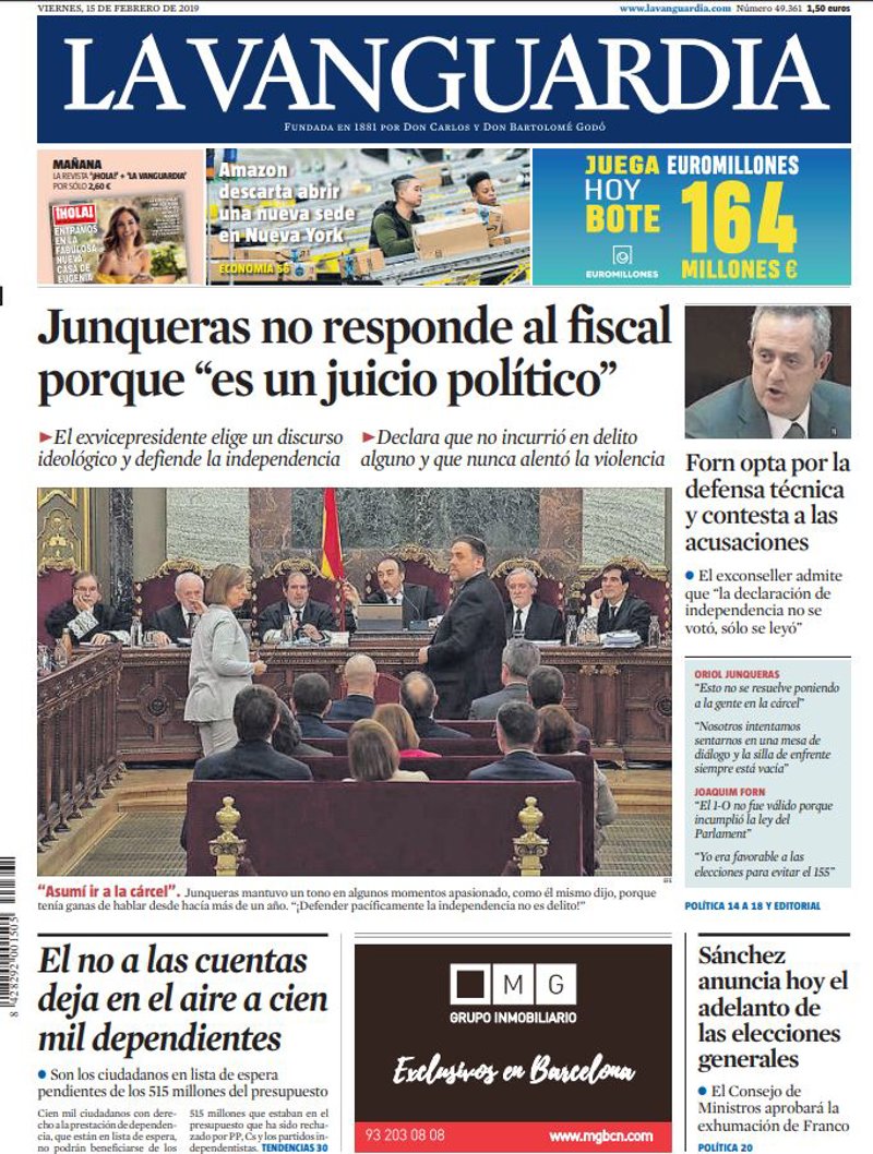 LA VANGUARDIA: "Junqueras no responde al fiscal porque 'es un juicio político'"; "Forn opta por la defensa técnica y contesta a las acusaciones"; "El no a las cuentas deja en el aire a cien mil dependientes"; "Sánchez anuncia hoy el adelanto de las elecciones generales".