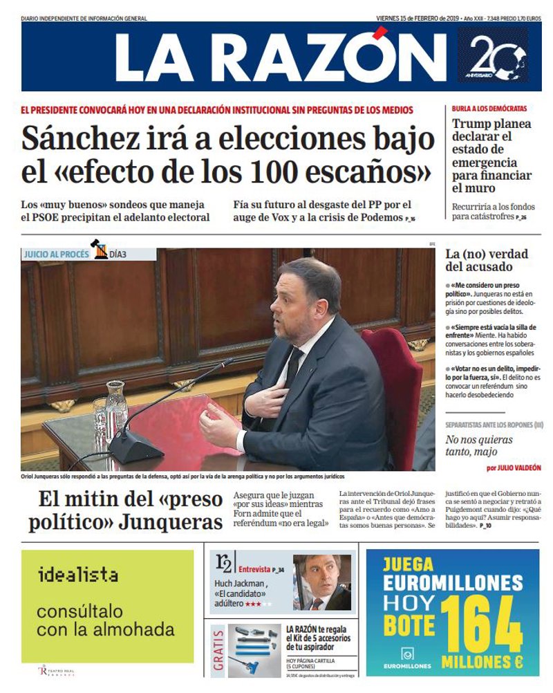 LA RAZÓN: "Sánchez irá a elecciones bajo el 'efecto de los 100 escaños'"; "Trump planea declarar el estado de emergencia para financiar el muro"; "El mitin del 'preso político' Junqueras"; "La (no) verdad del acusado"; "No nos quieras tanto, majo"; "Hugh Jackman, 'El candidato' adúltero".