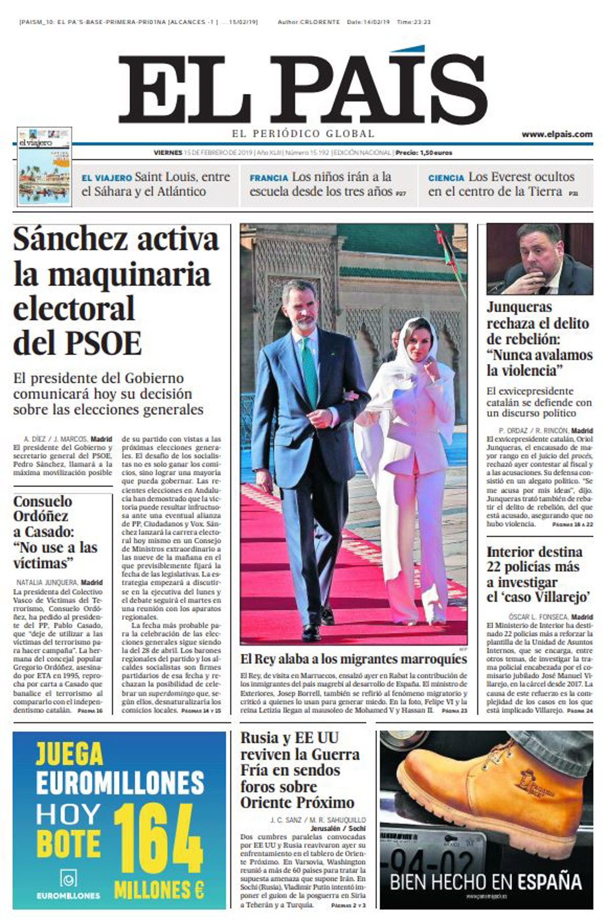 EL PAÍS: "Sánchez activa la maquinaria electoral del PSOE"; "Junqueras rechaza el delito de rebelión: "Nunca avalamos la violencia"; "Consuelo Ordóñez a Casado: 'No use a las víctimas'"; "Interior destina 22 policías más a investigar el 'caso Villarejo'"; "El Rey alaba a los migrantes marroquíes"; "Rusia y EE UU reviven la Guerra Fría en sendos foros sobre Oriente Próximo".