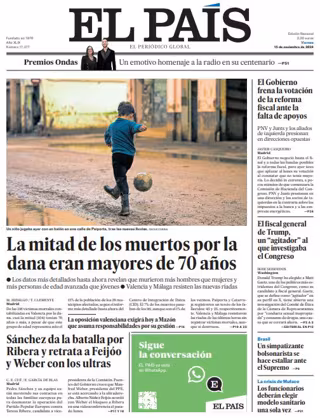 EL PAÍS: "La mitad de los muertos por la dana eran mayores de 70 años"; "Sánchez da la batalla por Ribera y retrata a Feijóo y Weber con los ultras"; "El Gobierno frena la votación de la reforma fiscal ante la falta de apoyos"; "El fiscal general de Trump, un "agitador" al que investigaba el Congreso"; "Un simpatizante bolsonarista se hace estallar ante el Supremo"; "Los funcionarios deberán elegir modelo sanitario una sola vez".