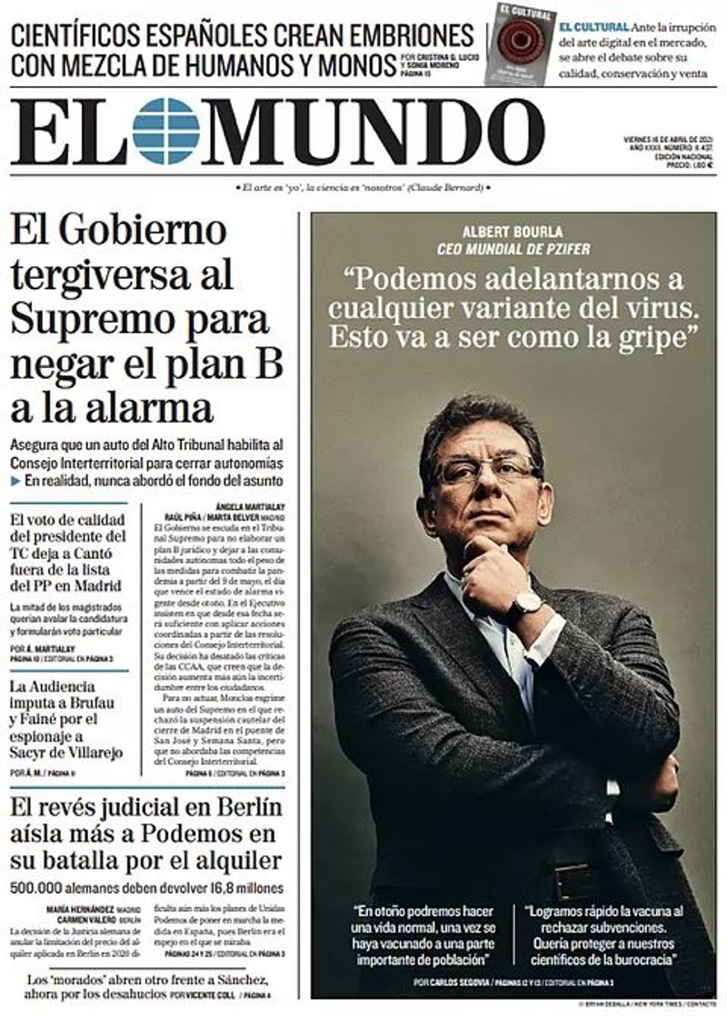 EL MUNDO: "El Gobierno tergiversa al Supremo para negar el plan B a la alarma"; "El voto de calidad del presidente del TC deja a Cantó fuera de la lista del PP en Madrid"; "La Audiencia imputa a Brufau y Fainé por el espionaje a Sacyr de Villarejo"; "El revés judicial en Berlín aísla más a Podemos en su batalla por el alquiler"; "Albert Bourla, CEO Mundial de Pfizer: "Podemos adelantarnos a cualquier variante del virus. Esto va a ser como la gripe"".