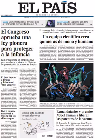 EL PAÍS: "El Congreso aprueba una ley pionera para proteger a la infancia"; "El juez imputa a Brufau y Fainé en el 'caso Villarejo'"; "Biden impone sanciones a Moscú por los ciberataques"; "Un equipo científico crea quimeras de mono y humano. El grupo que dirige el español Izpisua produce en un laboratorio chino 132 embriones con 10.000 células de ambas especies"; "Exmandatarios y premios Nobel llaman a liberar las patentes de la vacuna".