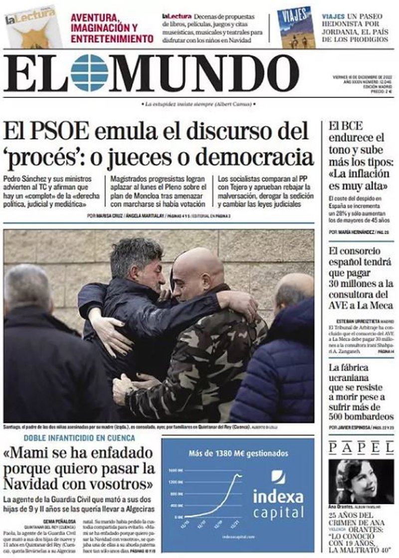 EL MUNDO: "El PSOE emula el discurso del 'procés': o jueces o democracia"; ""Mami se ha enfadado porque quiero pasar la Navidad con vosotros""; "El BCE endurece el tono y sube más los tipos: "La inflación es muy alta""; "El consorcio español tendrá que pagar 30 millones a la consultora del AVE a La Meca"; "La fábrica ucraniana que se resiste a morir pese a sufrir más de 500 bombardeos".