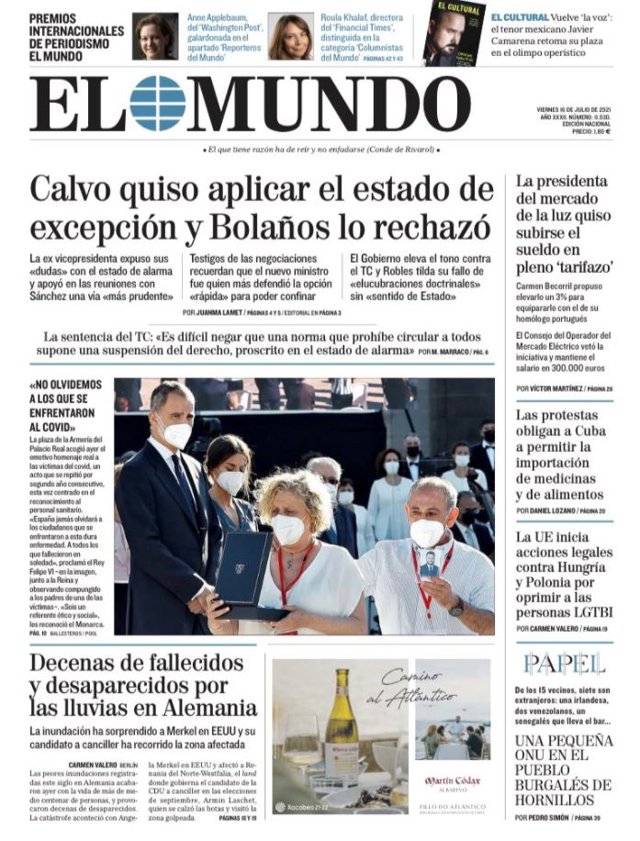 EL MUNDO: "Calvo quiso aplicar el estado de excepción y Bolaños lo rechazó"; "'No olvidemos a los que se enfrentaron al Covid'"; "Decenas de fallecidos y desaparecidos por las lluvias en Alemania"; "La presidenta del mercado de la luz quiso subirse el sueldo en pleno 'tarifazo'"; "Las protestas obligan a Cuba a permitir la importación de medicinas y de alimentos"; "La UE inicia acciones legales contra Hungría y Polonia por oprimir a las personas LGTBI".