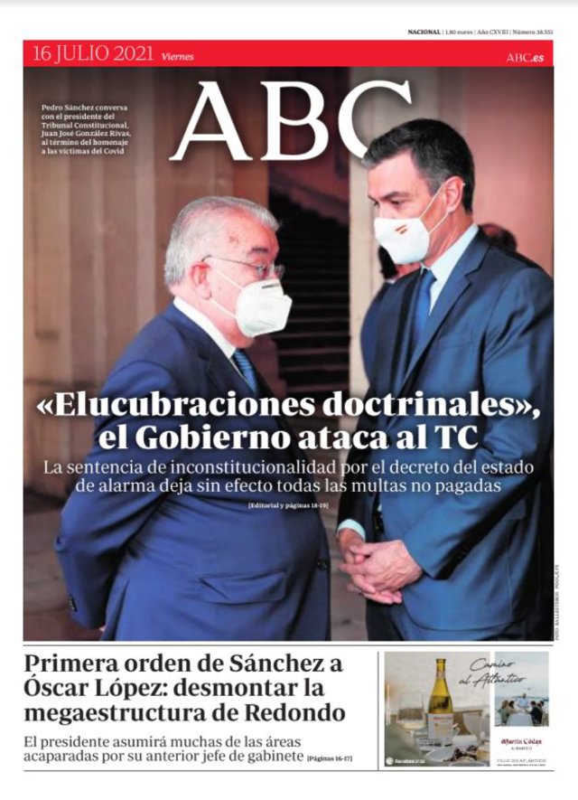 ABC: "'Elucubraciones doctrinales', el Gobierno ataca al TC"; "Primera orden de Sánchez a Óscar López: desmontar la megaestructura de Redondo".