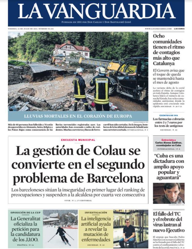 LA VANGUARDIA: "La gestión de Colau se convierte en el segundo problema de Barcelona"; "Ocho comunidades tienen el ritmo de contagios más alto que Catalunya"; "Lluvias mortales en el corazón de Europa"; "La Generalitat oficializa la petición para la candidatura de los JJ.OO."; "Los farmacias cobrarán entre 3 y 7 euros por los tests de antígenos"; "La inteligencia artificial ayuda a revelar la mutación de enfermedades"; "El fallo del TC y el rebrote del virus lastran al nuevo Ejecutivo"; "Carlos Alonso Zaldívar, exembajador en Cuba: 'Cuba es una dictadura con amplio apoyo popular y aguantará'".