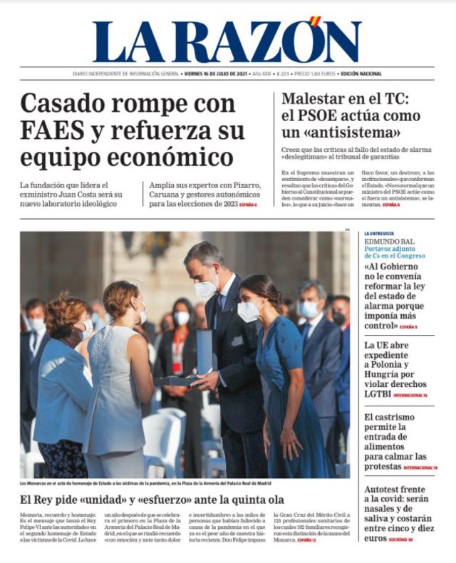 LA RAZÓN: "Casado rompe con FAES y refuerza su equipo económico"; "Malestar en el TC: el PSOE actúa como un 'antisistema'"; "El Rey pide 'unidad' y 'esfuerzo' ante la quinta ola"; "Edmundo Bal: 'Al Gobierno no le convenía reformar la ley del estado de alarma porque imponía más control'"; "La UE abre expediente a Polonia y Hungría por violar derechos LGTBI"; "El castrismo permite la entrada de alimentos para calmar las protestas"; "Autotest frente a la covid: serán nasales y de saliva y costarán entre cinco y diez euros".