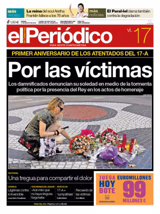 EL PERIÓDICO: "Por las víctimas"; "Primer aniversario de los atentados del 17-A"; "Una tregua para compartir el dolor"; "Lágrimas contra lo invencible"; Testimonio del ataque: "Aún miro que no haya ninguna furgoneta"; "Recuerdo de las víctimas".