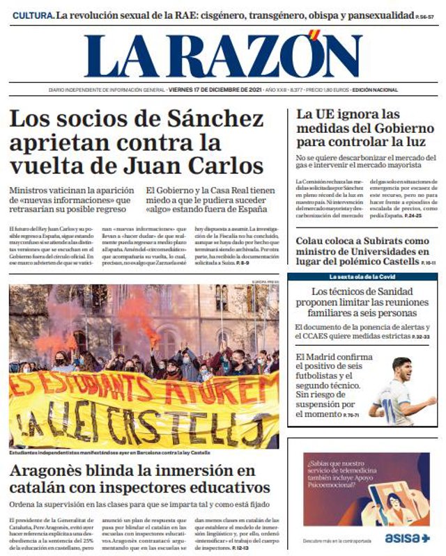 LA RAZÓN: "Los socios de Sánchez aprietan contra la vuelta de Juan Carlos"; "La UE ignora las medidas del Gobierno para controlar la luz"; "Aragonès blinda la inmersión en catalán con inspectores educativos"; "Colau coloca a Subirats como ministro de Universidades en lugar del polémico Castells".