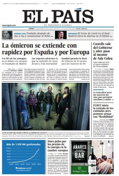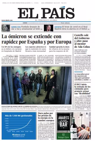 EL PAÍS: "La ómicron se extiende con rapidez por España y por Europa"; "Castells sale del Gobierno y abre paso al mentor de Ada Colau"; "El BCE inicia la retirada de los estímulos pero promete actuar con "flexibilidad""; "Duro pulso por los precios de la energía en la cumbre europea".