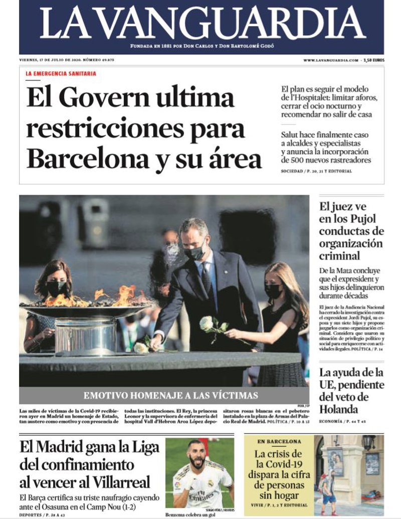 LA VANGUARDIA: "El Govern ultima restricciones para Barcelona y su área"; "Emotivo homenaje a las víctimas"; "El Madrid gana la Liga del confinamiento al vencer al Villarreal"; "El juez ve en los Pujol conductas de organización criminal"; "La ayuda de la UE, pendiente del veto de Holanda".
